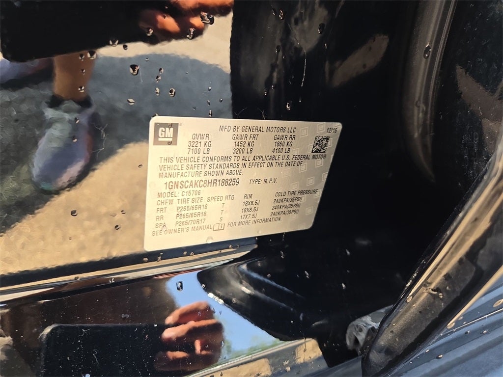 License Plate Front Mounting Package, Preferred Equipment Group 1LS (1st & 2nd Row Color-Keyed Carpeted Floor Mats, 2nd Row 60/40 Split-Folding Manual Bench, 3rd Row Manual 60/40 Split-Folding Fold Flat Bench, 4-Wheel Antilock Disc Brakes w/Brake Assist, Black Assist Steps, Color-Keyed Carpeting Floor Covering, Driver Inboard & Front Passenger Airbags, Driver Information Center, Electronic Cruise Control w/Set & Resume Speed, Extended-Range Remote Keyless Entry, Floor Console, Leather-Wrapped Steering Wheel, OnStar Basic Plan For 5 Years, Rear Park Assist w/Audible Warning, Remote Vehicle Start, Roof-Mounted Luggage Rack Side Rails, and SiriusXM Satellite Radio), Premium Smooth Ride Suspension Package, Jet Black Cloth, 18 x 8.5 Aluminum Wheels, 3.08 Rear Axle Ratio, 3rd row seats: split-bench, 4-Wheel Disc Brakes, 5 12-Volt Auxiliary Power Outlets, 6 Speakers, 6-Speaker Audio System Feature, 6-Way Power Front Passenger Seat Adjuster, ABS brakes, Air Conditioning, All-Weather Floor Mats, Alloy wheels, AM/FM radio: SiriusXM, Apple CarPlay/Android Auto, Automatic temperature control, Brake assist, Bumpers: body-color, Cargo Net, CD player, Compass, Delay-off headlights, Driver door bin, Driver vanity mirror, Dual front impact airbags, Dual front side impact airbags, Electronic Stability Control, Emergency communication system: OnStar Guidance, Exterior Parking Camera Rear, Front anti-roll bar, Front Bucket Seats, Front Center Armrest, Front dual zone A/C, Front High-Back Reclining Bucket Seats, Front reading lights, Front wheel independent suspension, Fully automatic headlights, Heated door mirrors, Illuminated entry, Low tire pressure warning, Occupant sensing airbag, Outside temperature display, Overhead airbag, Overhead console, Panic alarm, Passenger door bin, Passenger vanity mirror, Power door mirrors, Power driver seat, Power passenger seat, Power steering, Power windows, Premium audio system: Chevrolet MyLink, Premium Cloth Seat Trim, Radio: Chevrolet MyLink AM/FM Stereo, Rain sensing wipers, Rear air conditioning, Rear anti-roll bar, Rear reading lights, Rear seat center armrest, Rear window defroster, Rear window wiper, Remote keyless entry, Roof rack: rails only, Security system, Single-Slot CD/MP3 Player, Speed control, Speed-sensing steering, Split folding rear seat, Spoiler, Steering wheel mounted audio controls, Tachometer, Tilt steering wheel, Traction control, Trip computer, Variably intermittent wipers, and Voltmeter.