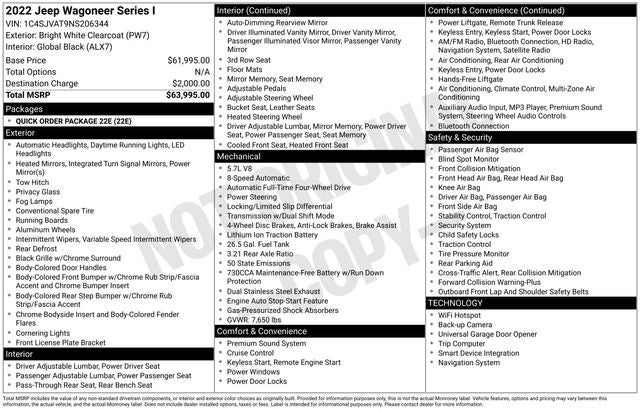 Boasting a suite of premium features, this Wagoneer Series I is meticulously equipped to cater to your every need. Key highlights include - a Back-Up Camera, the Quick Order Package 22E, and a state-of-the-art Navigation System. Additionally, you'll enjoy the convenience of - 10 Speakers, AM/FM radio: SiriusXM with 360L, and Air Conditioning with Automatic temperature control.